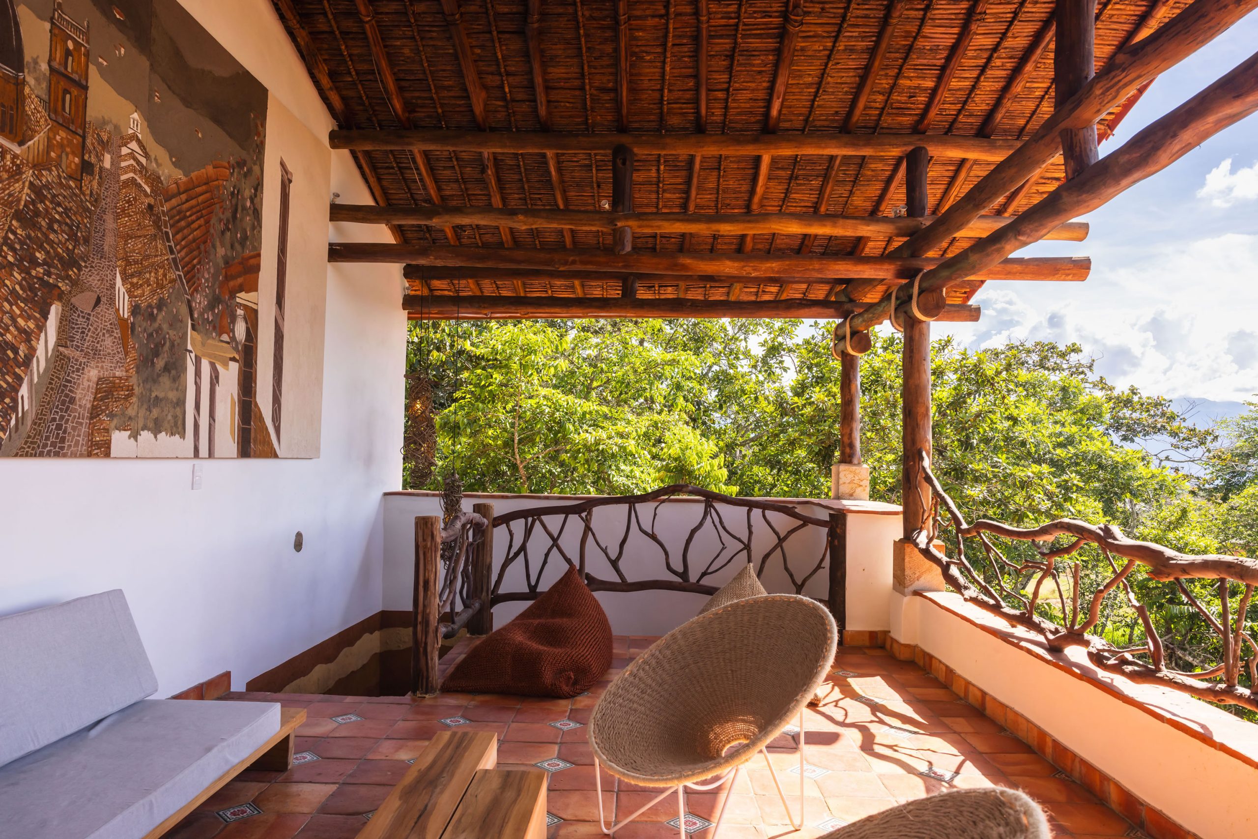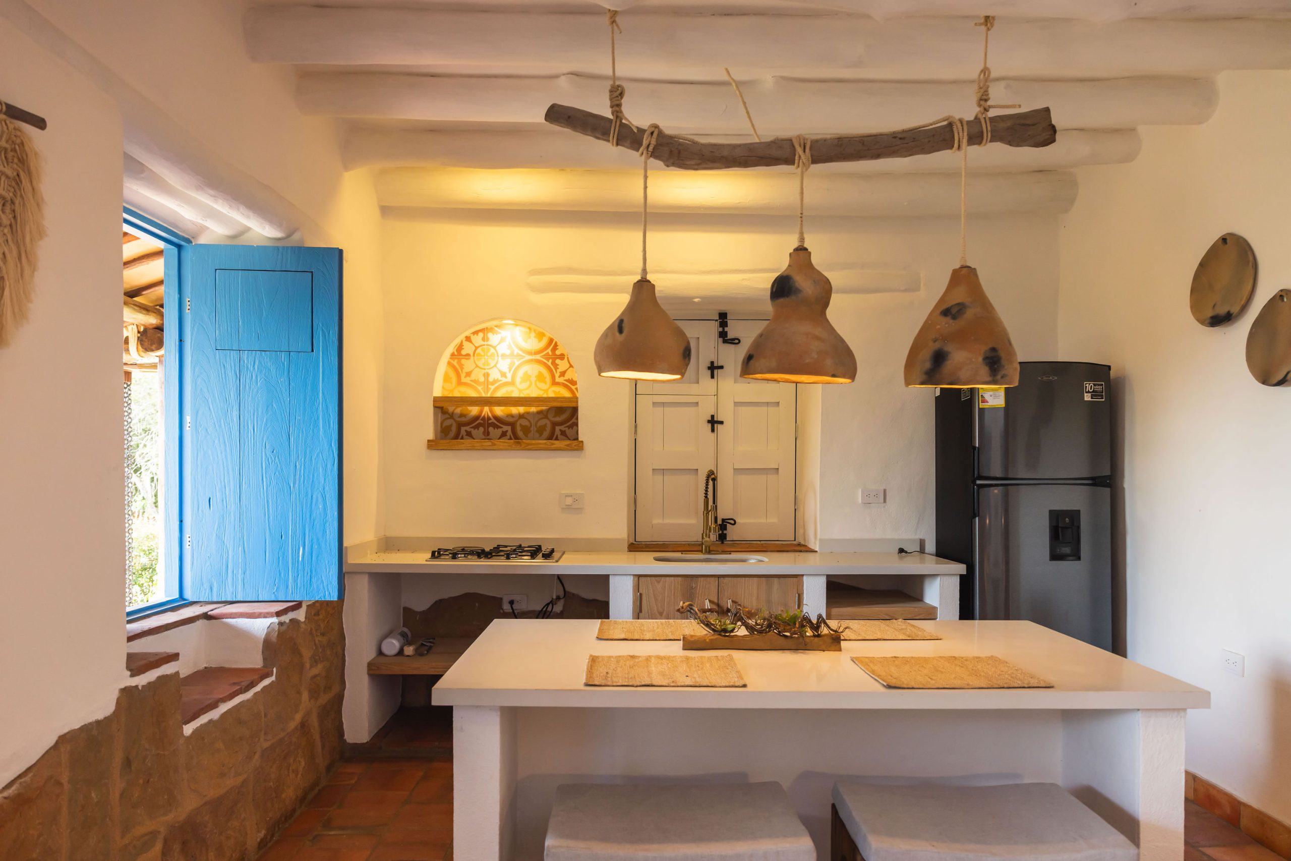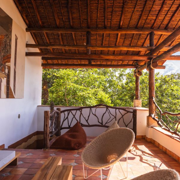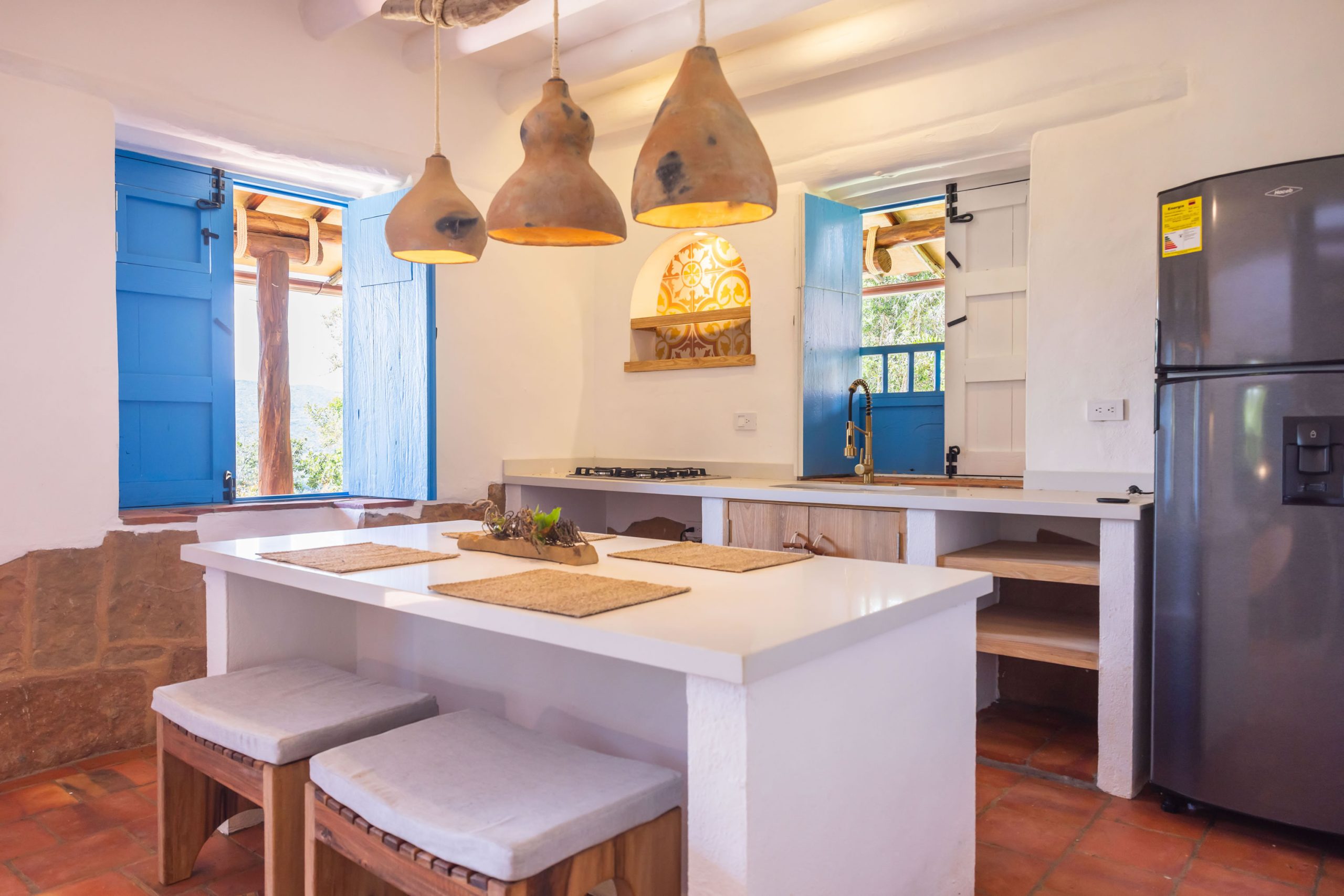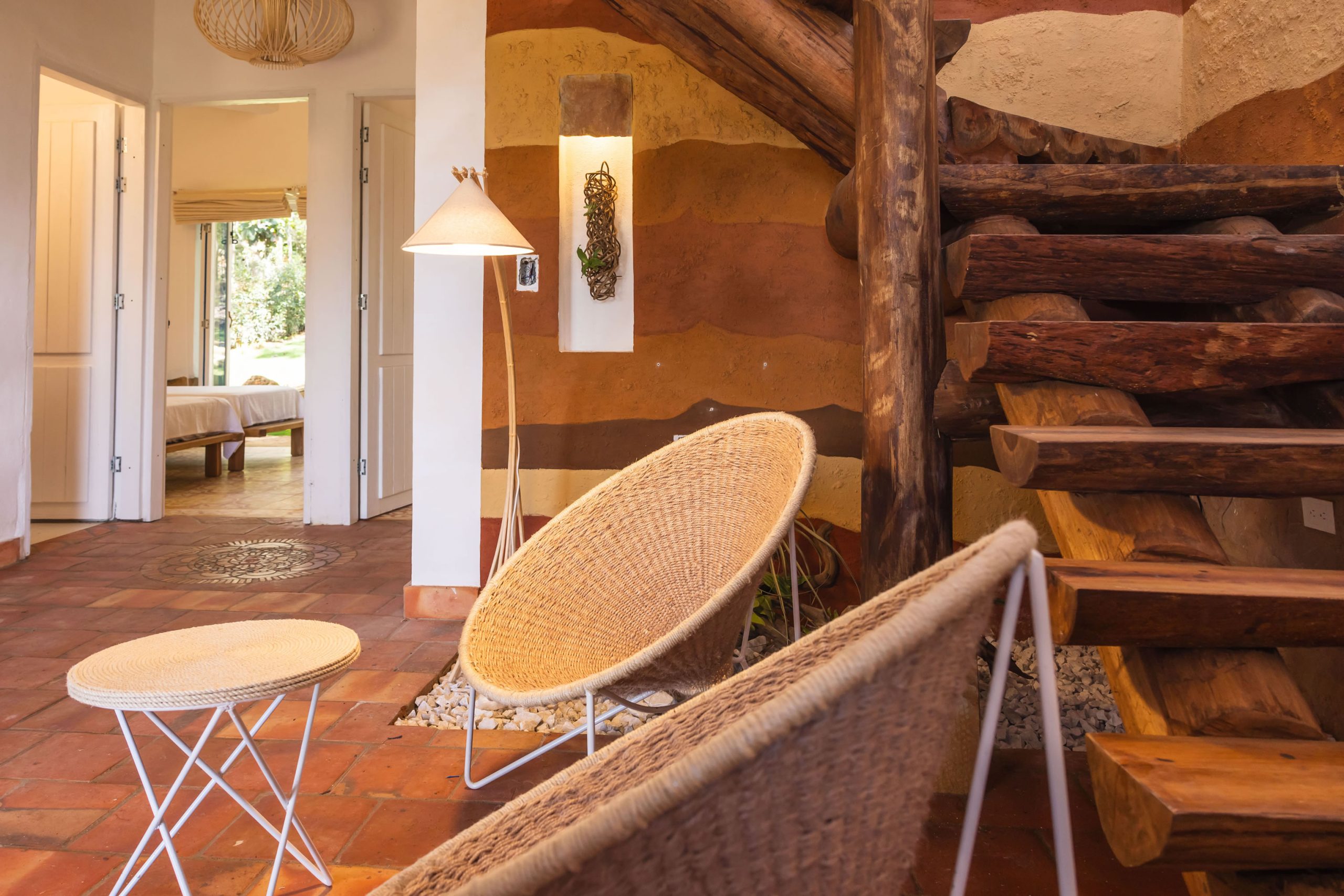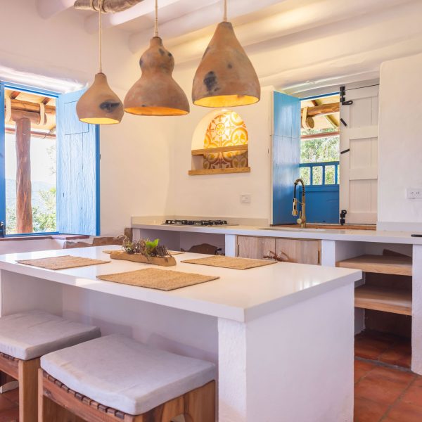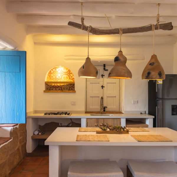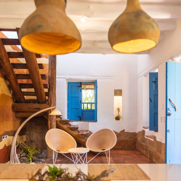 Inspirada en una casita tradicional del siglo XVII, combina techos altos con blancura interior, mobiliarios en materiales de la región y toques artísticos como la pintura en tierra y la cerámica ancestral, creando un ambiente elegante, cálido y lleno de carácter. Cuenta con hermosas vistas desde una bella terraza, que representa un caney para el secado del tabaco propio de la región.